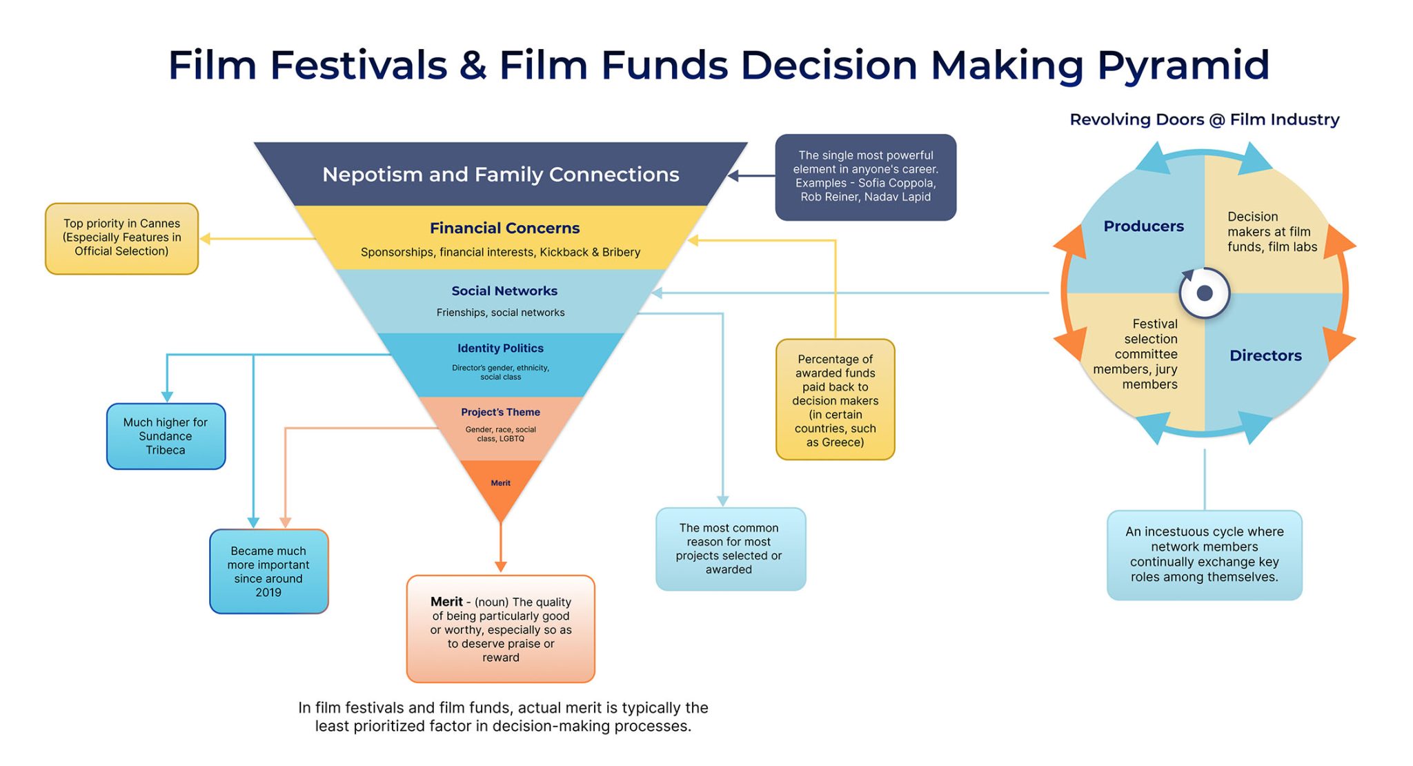 As the integrity of the industry has been degrading for years, so did the importance of artistic merit. The chart below provides a clear visual representation of the current unfortunate prioritized factors in decision-making processes within film festivals and film funding organizations.