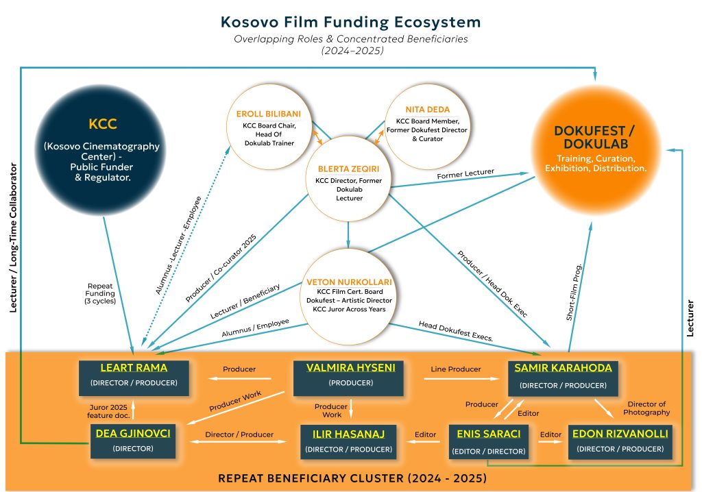 This tendency is particularly evident in the operations of major festivals. Accompanying the chart is a depiction of the “revolving door” dynamic prevalent in the film industry, where a limited circle of individuals hold a variety of influential positions, rotating between being fund advisors on the one hand, and producers or directors on the other. This perpetuates a culture of exclusivity, hindering fresh talent from entering the field, and promoting self-interests that ultimately reduces the quality of the industry’s artistic output.