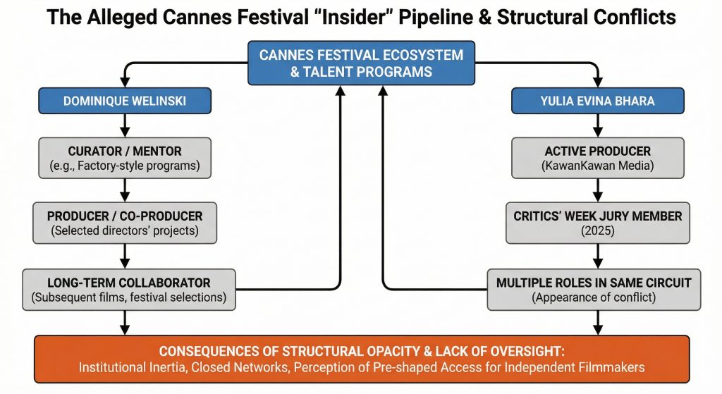Over the past few years, Film Industry Watch has reported on what appear to be alleged structural conflicts of interest inside major international film-festival and talent-development programs. Several figures – including Dominique Welinski and, more recently, Yulia Evina Bharahave been repeatedly referenced in public discussions about overlapping roles across curation, mentorship, jury role, production, and festival governance.