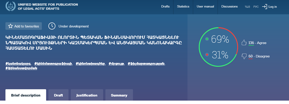 | 2024 թվականի հունվարի 29-ին ՀՀ արդարադատության նախարարության Իրավական ակտերի նախագծերի հրապարակման միասնական կայքում (https://www.e-draft.am/projects/6800) հրապարակվում է «Ներդրումների մասնակի վերադարձը տրամադրելու, մերժելու կամ դադարեցնելու կարգն ու պայմանները, ֆիլմարտադրության հետ անմիջականորեն կապված ապրանքների, ծառայությունների և աշխատանքների ցանկը և վերադարձի ենթակա դրամական ծախսերի չափը սահմանելու պայմաններն ու նորմատիվները հաշվարկելու նորմատիվները հաստատելու մասին» ՀՀ կառավարության որոշման նախագիծը, որը անզեն աչքով հակասում է 2023 թվականի ՀՕ-291-Ն օրենքին: | On January 29, 2024, the RA Ministry of Justice’s unified legal acts website (https://www.e-draft.am/projects/6800) published a draft Government decision “On the Procedure and Conditions for Granting, Rejecting, or Terminating Partial Reimbursement of Investments, on the List of Goods, Services, and Works Directly Related to Film Production, and on the Norms for Calculating the Amount of Refundable Monetary Expenditures,” which, even to the naked eye, contradicts the 2023 Law HO-291-N. |