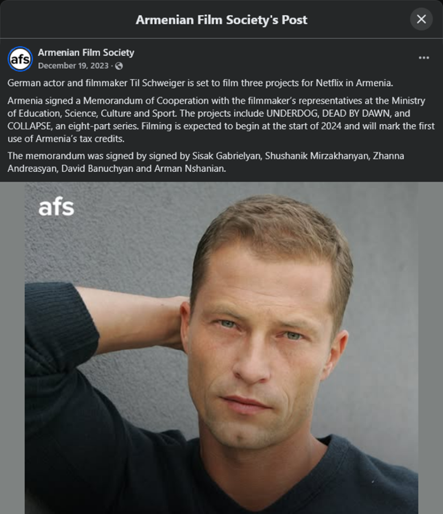 | 2023 թվականին նորություն տարածվեց, որ Հայաստանում NETFLIX-ի համար ֆիլմեր ու սերիալներ կնկարահանվեն (https://www.azatutyun.am/a/32736877.html): Նորության աղբյուրն էր Սիսակ Գաբրիելյանը: Դեռ չի հասցրել նորաստեղծ օրենքի «թանաքը չորանալ» Նախարարության կայքից (https://escs.am/am/news/19744) պարզ է դառնում, որ Նախարարությունը 2023 թվականի դեկտեմբերի 18-ին կնքել է քառակողմ հուշագիր «Փիփլ Օֆ Ար» ՍՊԸ-ի հետ, որում մասնավորապես սահմանվում է՝ «Հայաստանի Հանրապետության պետական մարմինները կաջակցեն Թիլ Շվայգերի «Underdog», «Dead by Dawn», «Collapse»/8մաս ֆիլմերի ներդրումների մասնակի վերադարձ (cash rebate) տրամադրելու գործընթացին՝ «Կինեմատոգրաֆիայի մասին» ՀՀ օրենքի համապատասխան հոդվածների համաձայն»: Հուշագրի կնքվել է ՀՀ ԿԳՄՍ նախարարության, ԱԺ գիտության, կրթության, մշակույթի, սփյուռքի, երիտասարդության և սպորտի հարցերի մշտական հանձնաժողովի, «Հայաստանի ազգային կինոկենտրոն» պետական ոչ առևտրային կազմակերպության և «Փիփլ Օֆ Ար» ընկերության միջև: | In 2023, news spread that films and series would be produced in Armenia for Netflix (https://www.azatutyun.am/a/32736877.html). The source of the news was Sisak Gabrielyan. Before the ink of the newly passed law dried, it became clear from the Ministry’s website (https://escs.am/am/news/19744) that on December 18, 2023, the Ministry signed a four-party memorandum with “People of Ar” LLC, which specifically stated: “The state bodies of the Republic of Armenia will support the process of providing partial reimbursement (cash rebate) for the films ‘Underdog,’ ‘Dead by Dawn,’ and ‘Collapse’/8 episodes by Til Schweiger, in accordance with the relevant articles of the Law on Cinematography.” The memorandum was signed between the RA Ministry of Education, Science, Culture and Sports (MoESCS), the NA Standing Committee on Science, Education, Culture, Diaspora, Youth and Sport, the “National Cinema Center of Armenia” SNCO, and “People of Ar” LLC. |