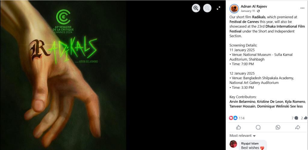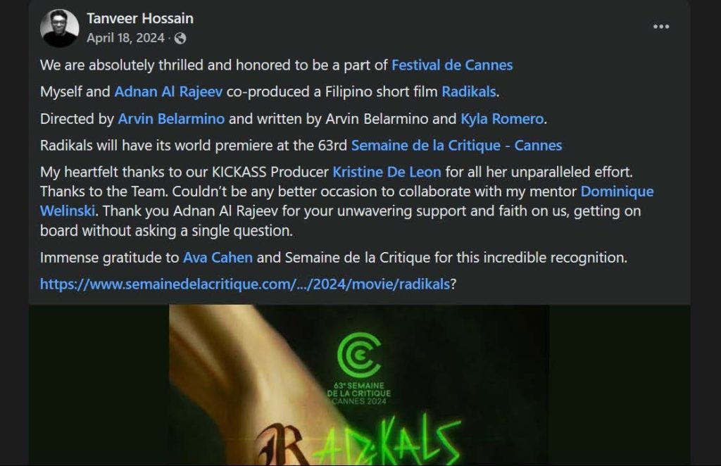 “There’s also one more Arvin Belarmino connection in the Official Selection for Festival de Cannes 2025. He is the Screenplay Writer for the Bangladeshi film ‘Ali’, which is also competing for the Short Film Palme d’Or.”