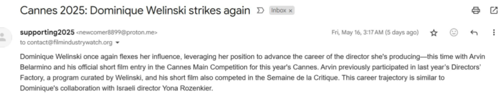 Dear Angela, Ms. Welinski is referenced because she is central to this particular story. How could we write this article without including the names of the persons and films involved? All details included are sourced and part of the public record. Our articles are based on information shared with us by filmmakers who raise concerns about these practices, the email regarding this case is shown above. We only publish information that we can verify. In this case, it involves Ms. Welinski; tomorrow, it may be someone else. Many of the incidents reported to us are not published precisely because we cannot confirm and source them. We ask that if there is any mistake in this article, or any other, that our readers contact us so such mistakes can be corrected.