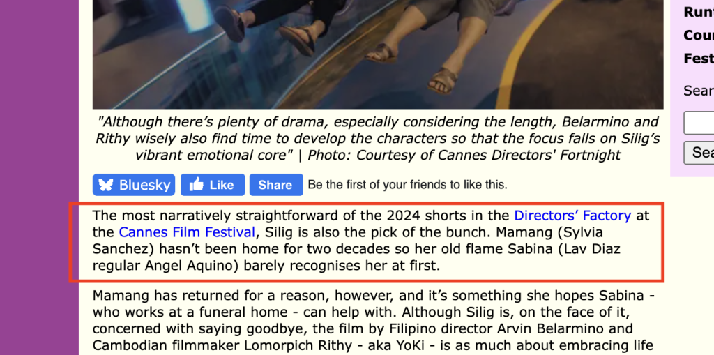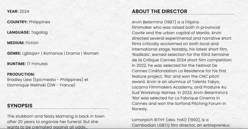 - Belarmino participated in the Directors’ Factory 2024 program, which is curated by Welinski, directing a short film called “SILIG” with Cambodian filmmaker Lomorpich Rithy