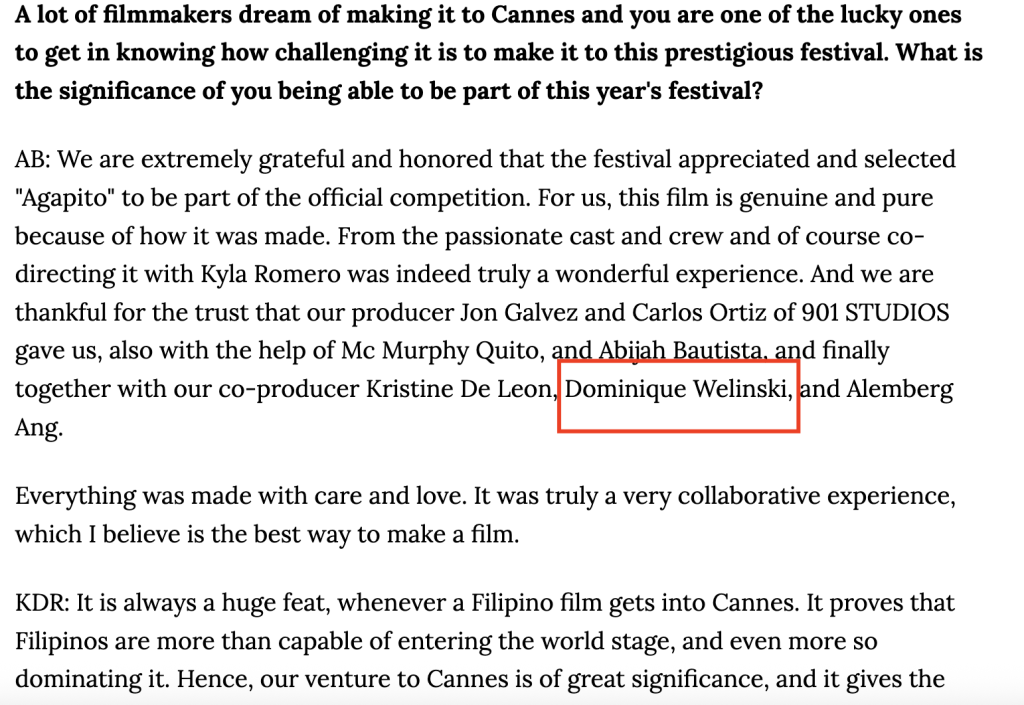 “Dominique Welinski has deep ties with the producers from the Philippines who have several projects through the years in Cannes sections.