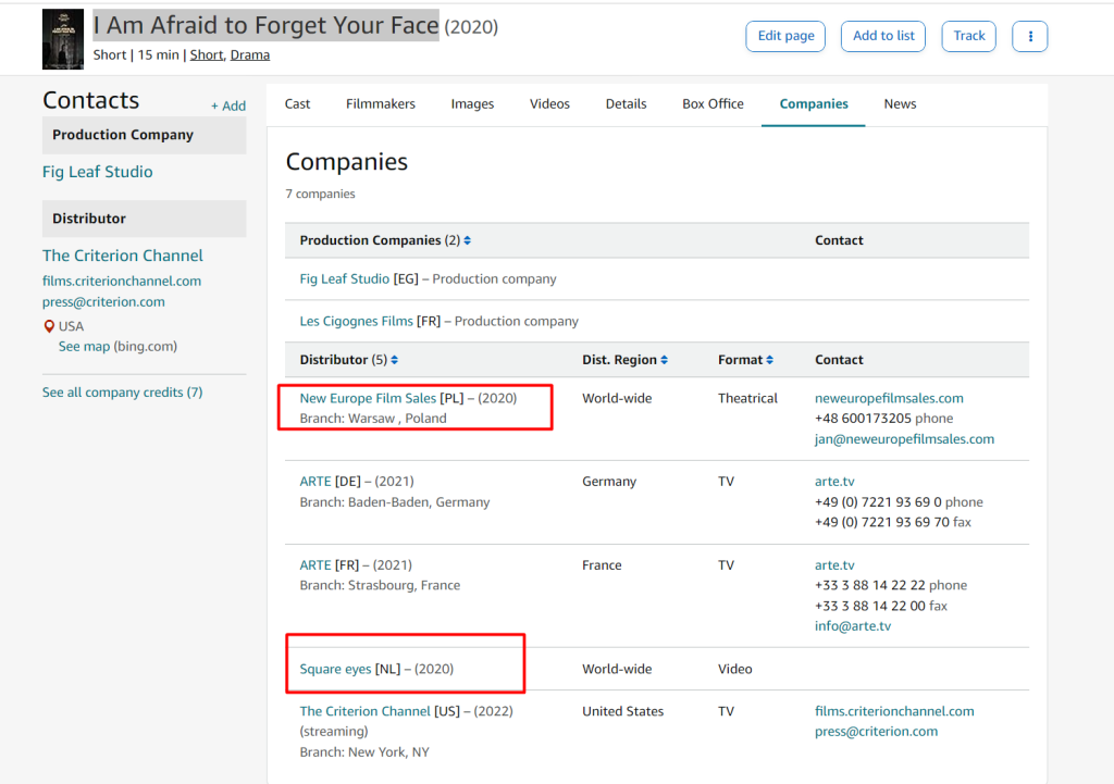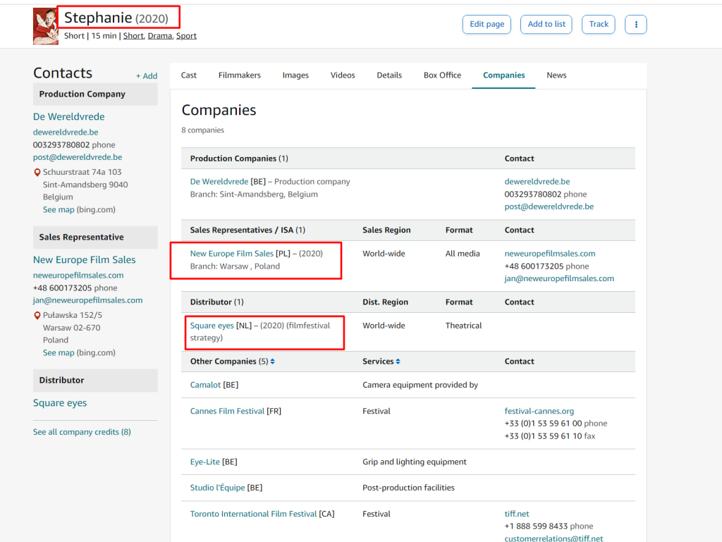 In addition, there are eight short films which are featured on the website for which ‘New Europe Sales’ is doing sales, while Square Eyes is doing “festival strategy” / distribution. These numbers represent almost half of the films that New Europe Sales had worked on during this time: