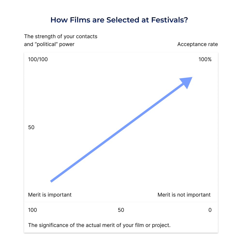 The charts below depict how a film or project’s actual merit relates to the director or producer’s contacts, political influence, and other factors within the film industry. They illustrate a trend: as a person’s social (“political”) or commercial power increases, the film’s merit decreases in importance. Similarly, the prestige of a festival inversely affects the significance of merit, with other factors becoming more prominent – READ MORE.