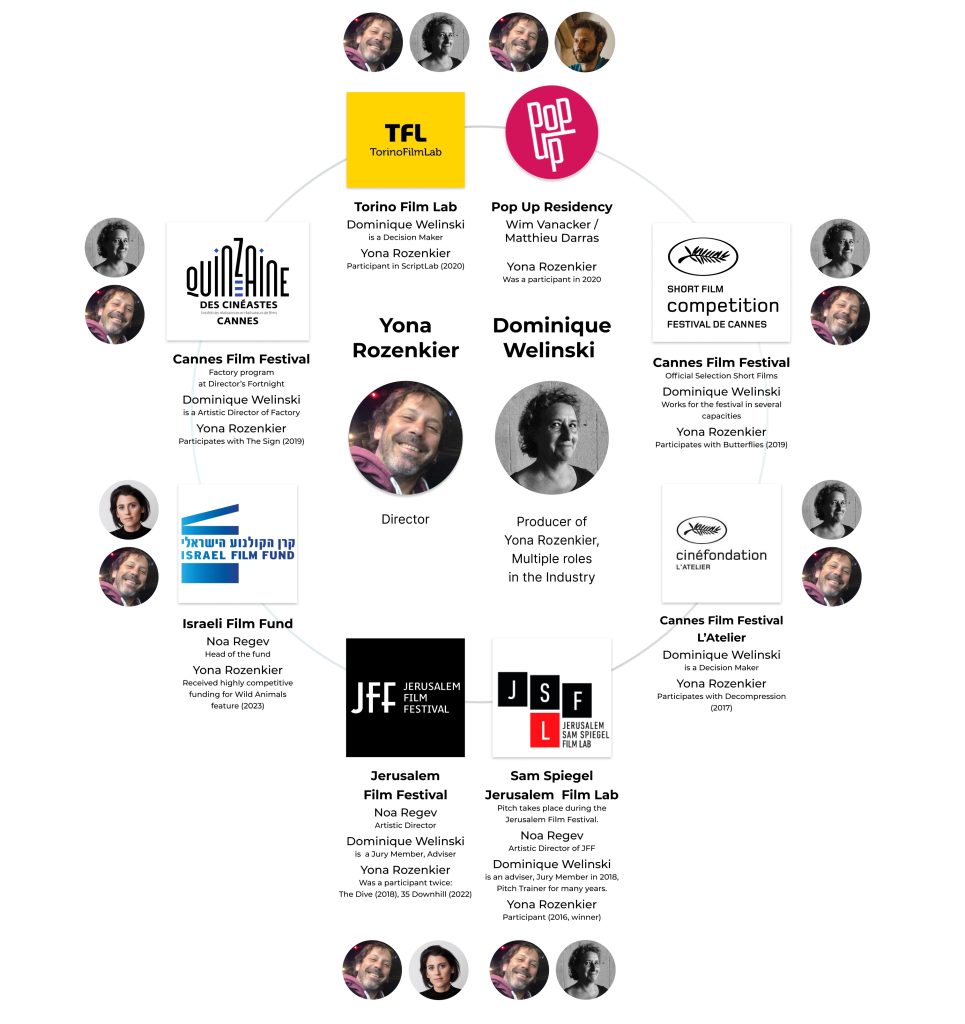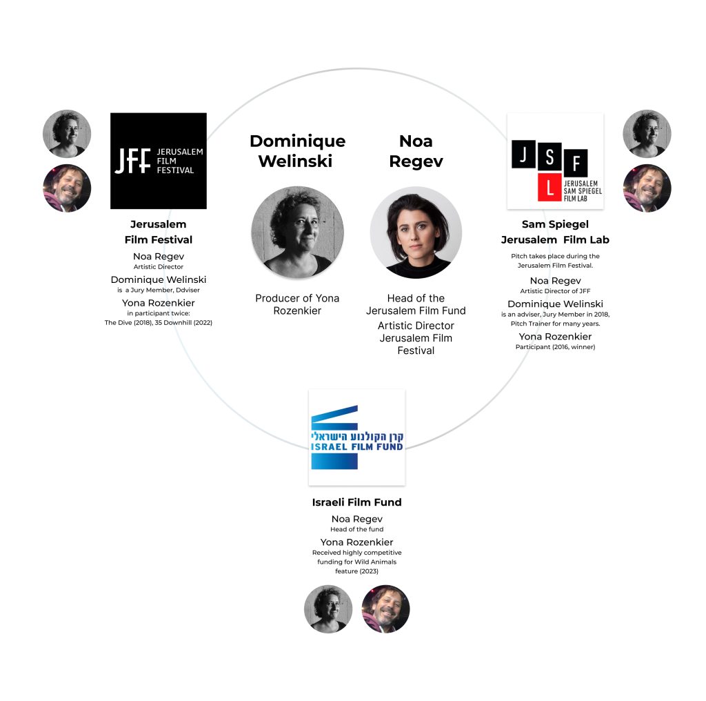 The following chart further details the connections between Welinski and Regev across three distinct organizations. Firstly, at the Jerusalem Film Lab, Welinski serves as an adviser, and it was here that Rozenkier’s project was chosen and received an award.