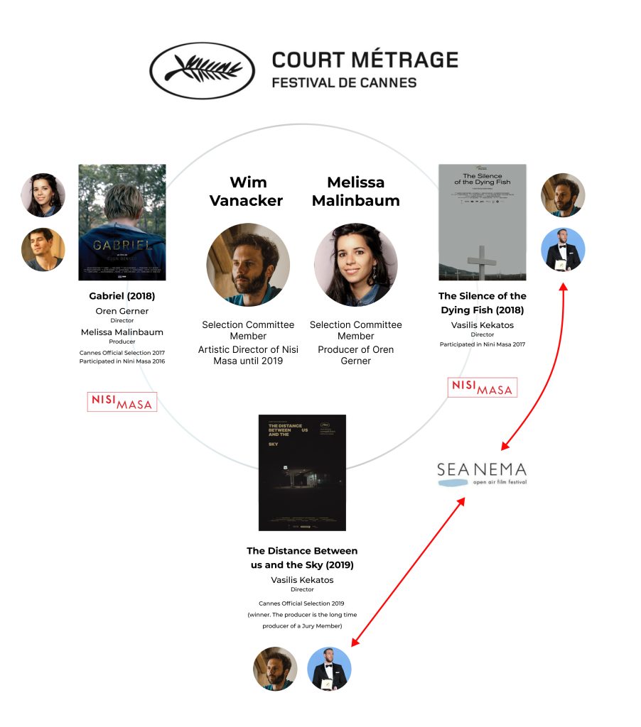 In 2017, ‘Gabriel’ by Oren Gerner, a short film produced by Melissa Malinbaum, was chosen to the festival. This selection came a year after the film’s participation in NISI MASA in 2016, during which time Wim Vanacker, ALSO a Cannes selection committee member, was its Artistic Director (if you’re confused already, use the chart below.)