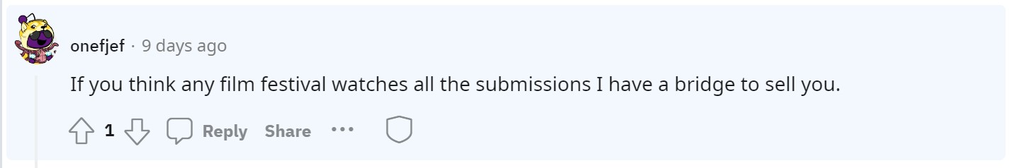 Consider this: how is it that, amid thousands of submissions from filmmakers, writers, directors, and producers, it’s always the same few who seem to be chosen repeatedly for various festivals or labs, and who secure funding opportunities? Meanwhile, the vast majority struggle to make a mark in the industry, with many not even having their films viewed. To quote one commenter, “If you think any film festival watches all the submissions, I have a bridge to sell you.”