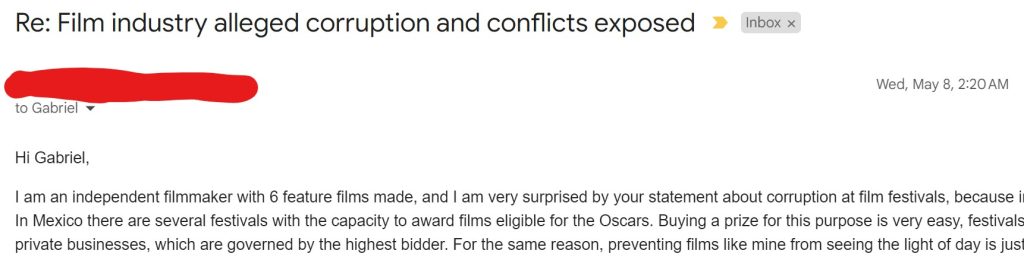 “I am an independent filmmaker with 6 feature films made, and I am [not] surprised by your statement about corruption at film festivals, because in Mexico it is regrettable. In Mexico there are several festivals with the capacity to award films eligible for the Oscars. Buying a prize for this purpose is very easy, festivals are almost entirely private businesses, which are governed by the highest bidder. For the same reason, preventing films like mine from seeing the light of day is just as easy. As far as I know, openly declared by juries and festival directors, I am on a blacklist. Freedom of creation and freedom of expression in cinema is increasingly restricted and trampled on, and festivals serve to close the door and the commercial path to uncomfortable films.”