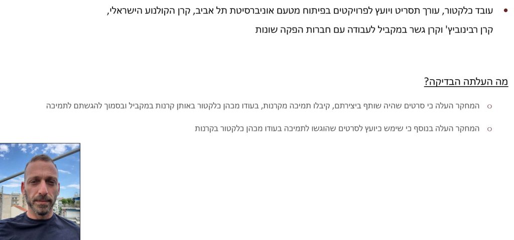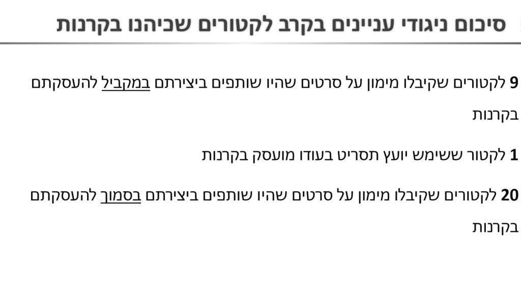 | חברי תעשיית הקולנוע הישראלית שיש להם מידע נוסף על שחיתות בקרנות, במיוחד בקרן רבינוביץ ועל דלתות מסתובבות בין מועצת הקולנוע לתפקידים בקרן, ומימון של פרויקטים אישיים של חברי מועצה, ובין קשרים של ראשי הקרנות, עובדי קרנות ולקטורים ומי שקיבלו מימון בצורה מושחתת, בבקשה צרו קשר |
