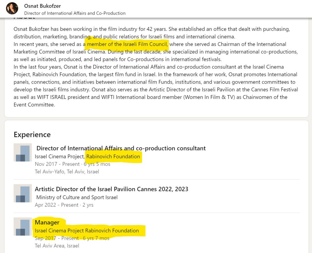 As can be seen in the example below, Osnat Bukofzer, who currently works for the Rabinovich Foundation, has severed as a member of the Film Council for several years. In addition, Bukofzer manages the Israeli Pavilion in Cannes, which the Rabinovich Foundation finances. Having served as a member on the Israeli Film Council and making decisions that directly effect the amount of money that the fund received, this is a clear case of a conflict of interest, where favors are exchanged over a long period of time, in the form of employment and other positions within the industry. Our sources report that this is far from being the only case and that over the years several compromised council members have been working to promote the interests of the Rabinovich Foundation from within the council, including the former head of the council, who kept a very close relationship, (some say intimate, but this is alleged) with the head of the fund. The case of Bukofzer is just one examples of many that we will reveal in our upcoming article about the Rabinovich Foundation, known in the local industry as being completely corrupt, having been controlled by the same individuals for over 20 years.