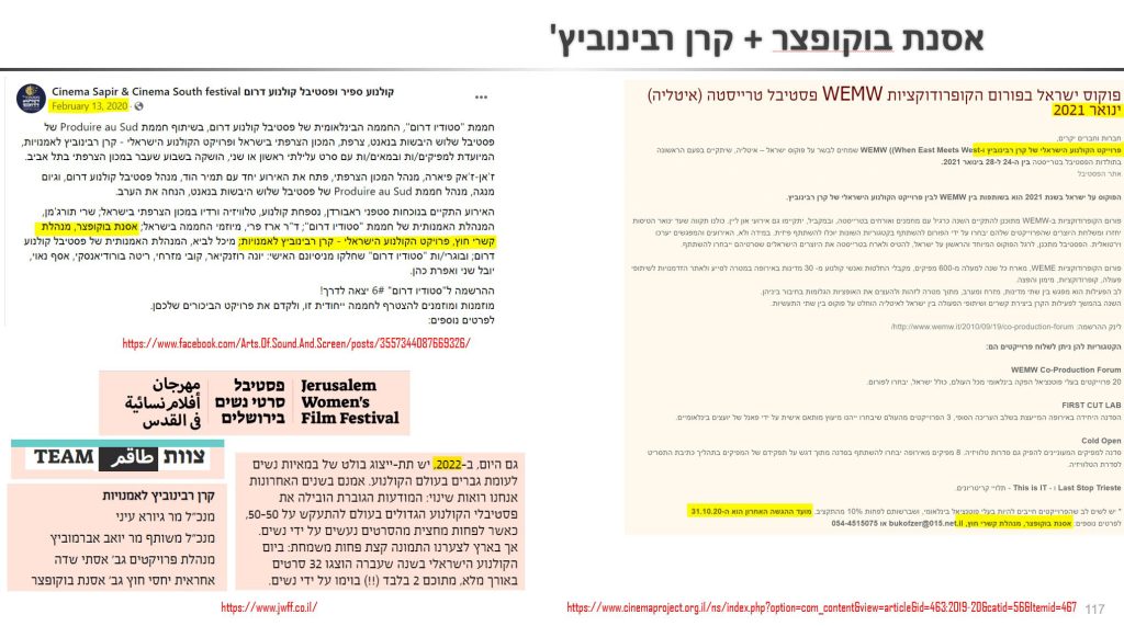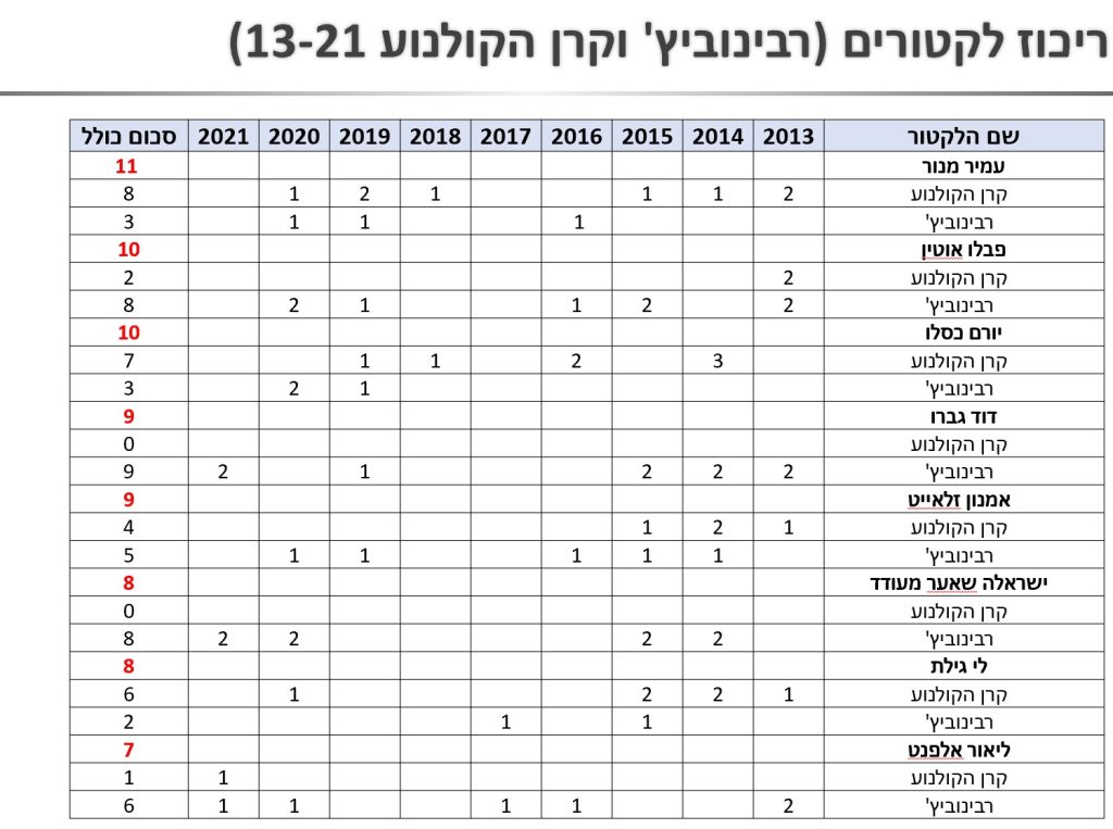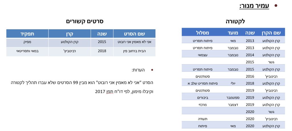 In addition, as part of our ongoing investigation into the Rabinovich Foundation, currently the largest film fund in Israel, an additional revolving door has been observed, one that involves the fund and members of the Israeli Film Council, the governmental body that distributes funding to the various Israeli Film Funds.