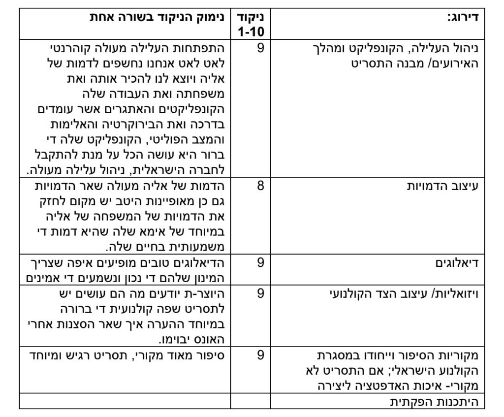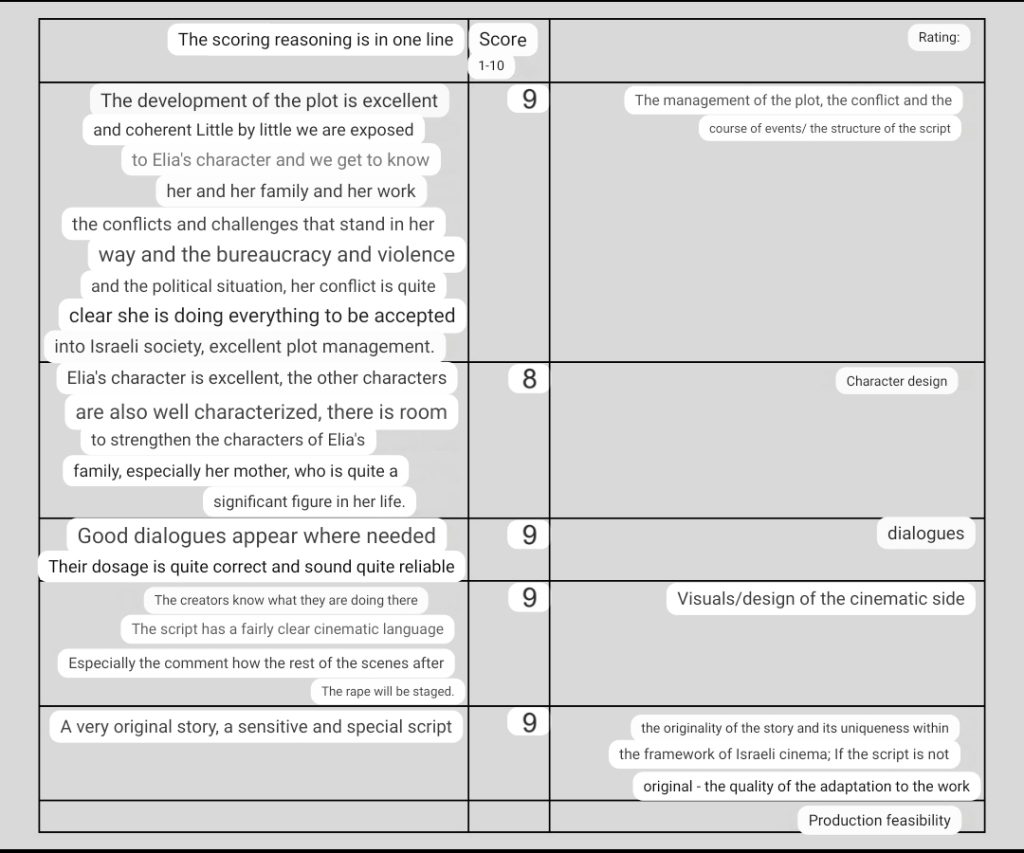 The filmmaker indeed did not receive funding from the fund as Manor predicted, nor in the next and final round, despite the script receiving the following scores, averaging 9 out of 10, simply because he is not part of the local clique, or “syndicate” of people belonging to the network, many of which are listed in the table at the bottom of this article, individuals who are both repeatedly hired by the fund as script readers or advisers, and granted production money by it.