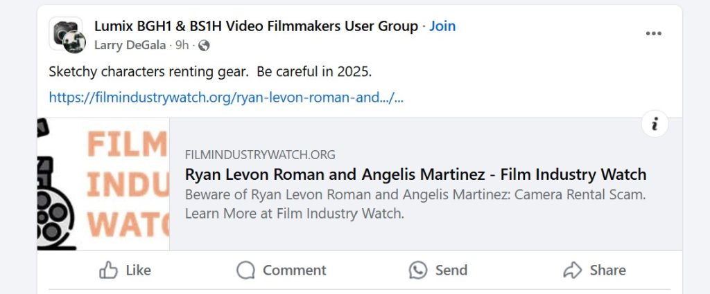 Ryan Levon Roman and Angelis Martinez allegedly rent cameras for long periods and never pay for them or return them. A major red flag is that they do not have production insurance as they’ve allegedly already been banned by the insurance companies. They often look for same-day rentals so you do not have enough time to background check them. They insist on working with wires and bank transfers to allegedly avoid payment. Check this ESTA search for more information. They are mostly active in the US.