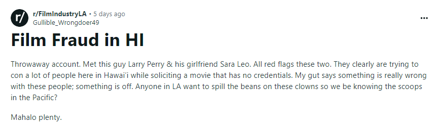 The situation started when someone in Hawaii’s film community met Larry Perry and Sara Leo and felt that something was wrong. This person, who wanted to stay anonymous, noticed warning signs about what Perry and Leo were doing. They seemed to be trying to get people involved in a movie project, but there were doubts about whether this project was real and properly set up. The person who saw all this couldn’t shake the feeling that Perry and Leo might be up to no good, so they decided to look for more information to figure out what was really going on.