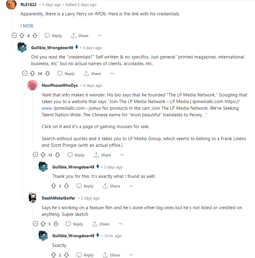 Recent discussions have raised additional concerns about Larry Perry’s credibility. Users have pointed out that Perry’s IMDb profile appears to be self-written and lacks specific details about his achievements in the film industry. Furthermore, his claim of founding “The LP Media Network” leads to a dubious website selling gaming mouses, casting further doubt on his legitimacy. Users also noted that despite claims of working on major film projects, Perry is not credited with any significant productions. These inconsistencies have led to suspicions that Perry might be a scammer, using fabricated credentials to mislead others in the industry.