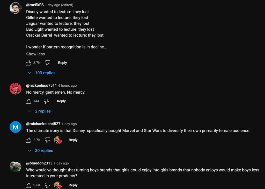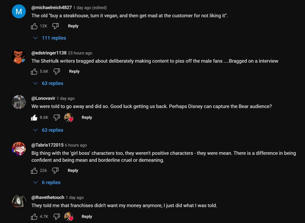 The reaction to The Critical Drinker’s video underscores how deep the alienation runs. Top-voted comments describe the shift in blunt economic terms: “buy a steakhouse, turn it vegan, and then get mad at the customer for not liking it.” Others highlight how creators openly bragged about provoking male fans (“The She-Hulk writers bragged about deliberately making content to piss off male fans”), or note the simple calculus of disengagement (“They told me that franchises didn’t want my money anymore, I just did what I was told”).