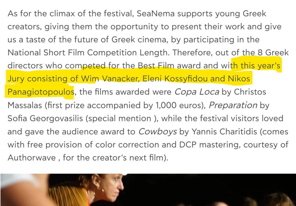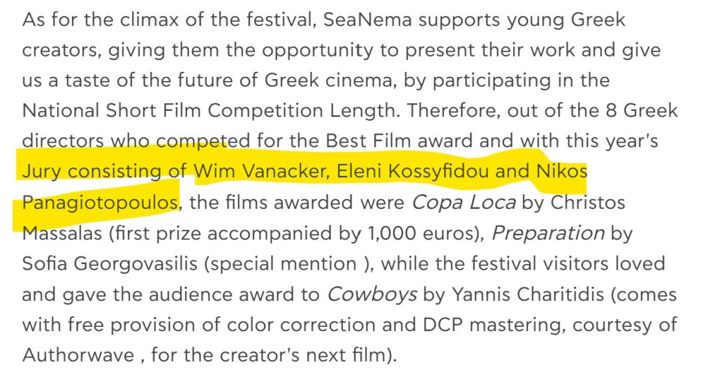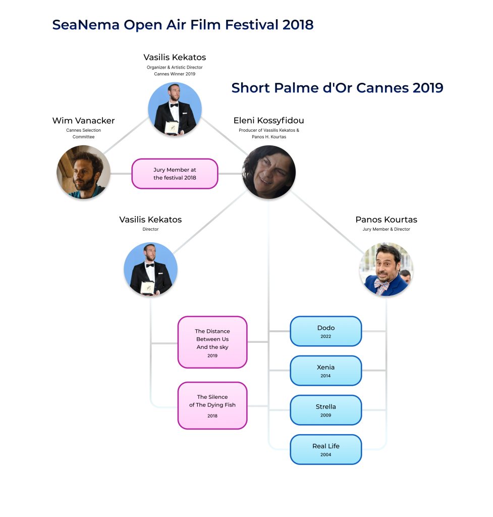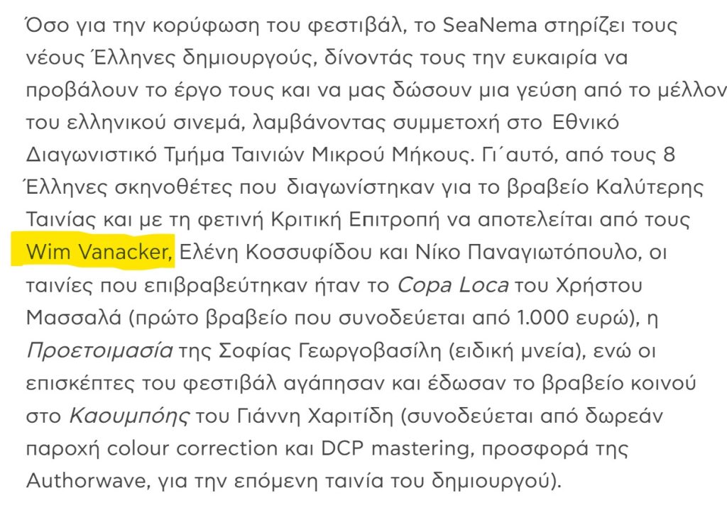 - Kekatos invited Vanacker to serve as a jury member at the SeaNema Open Air Film Festival, organized by Kekatos on Kefalonia.