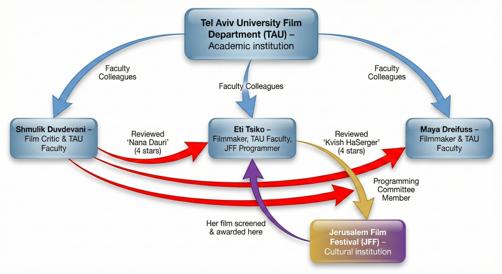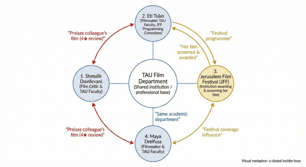 What we see now with Tel Aviv University, Ynet, and the Jerusalem Film Festival is the same logic in a different corner of the system. The critic doesn’t just happen to like two films. He is embedded in the same institutional network as their directors. One of those directors is also a programmer at a major festival. That festival, like others, has a documented history of overlapping jurors and filmmakers, including one who has been mentioned on the site multiple times in relation to other conflicts of interests. The funds feeding the industry have documented allegations of revolving doors between evaluators and beneficiaries.