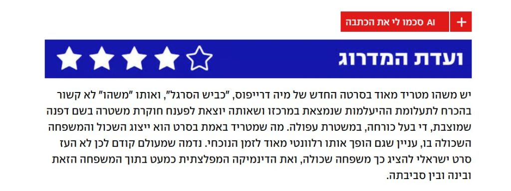 If the first case could be dismissed as a one-off lapse, the second one makes that impossible. On 2 February 2025, Ynet published another raving, four-star review by the same critic, Shmulik Duvdevani. This time, the subject was “Kvish HaSargel” (“כביש הסרגל”), a feature by Maya Dreifuss. Dreifuss is also a filmmaker and also a faculty member in the same Tel Aviv University film department. In this review, there is no disclosure at all. No mention of the fact that critic and director share the same institutional home. No hint that the review is of a colleague’s film. To the reader, it appears as purely independent judgment. To anyone looking at the structure, it is anything but.